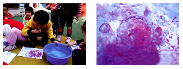 活动目标 1.自主选色调色,感受色彩变化,比较透明泡泡液和彩色泡泡液的区别。 2.尝试用吹泡泡的方法作画,体验吹画的乐趣。 3.能大胆想象,感受彩色泡泡的美。 活动准备 1.泡泡水,水粉颜料(颜料调的厚一些,便于作画,也可避免彩色泡泡吹得到处都是),素描纸,吸管。 2.吹泡泡的相关视频。 活动过程 1.吹泡泡游戏。 (1)玩吹泡泡游戏,说说泡泡在阳光下的色彩变化。 (2)播放视频,激发幼儿对泡泡的形态变化产生兴趣。 2.讨论与操作如何让泡泡留在纸上。 (1)教师:我们怎么样才能让泡泡落在纸上呢? (吹了泡泡,然后用纸接着;直接向纸上吹泡泡) (2)教师:我们向纸上吹泡泡时,吹得太高,泡泡就跑了,所以,我们要吹得有一点点高,泡泡就能轻松地落在纸上。 (教师边讲解边示范) (3)教师:我们还可以轻轻地、慢慢地吹,还可以……(“……”部分,可以让幼儿自己想,自己尝试,也可以是教师引导) 要点提示 1)将颜料调匀后再喝泡泡液调和。 2)鼓励幼儿www.www.hunancandle.com自主选色调色,感受色彩变化,比较透明泡泡液和彩色泡泡液的差别。 3.操作与评价。 建议:让幼儿交流作品中泡泡的奥秘。 (班级之间交流、同伴之间交流或展览交流) 【评析】 泡泡里的世界是孩子们的世界,泡泡下的画儿是有小奥秘的画儿,泡泡里有孩子们斑斓的乐趣,泡泡里是孩子们想象的草原……